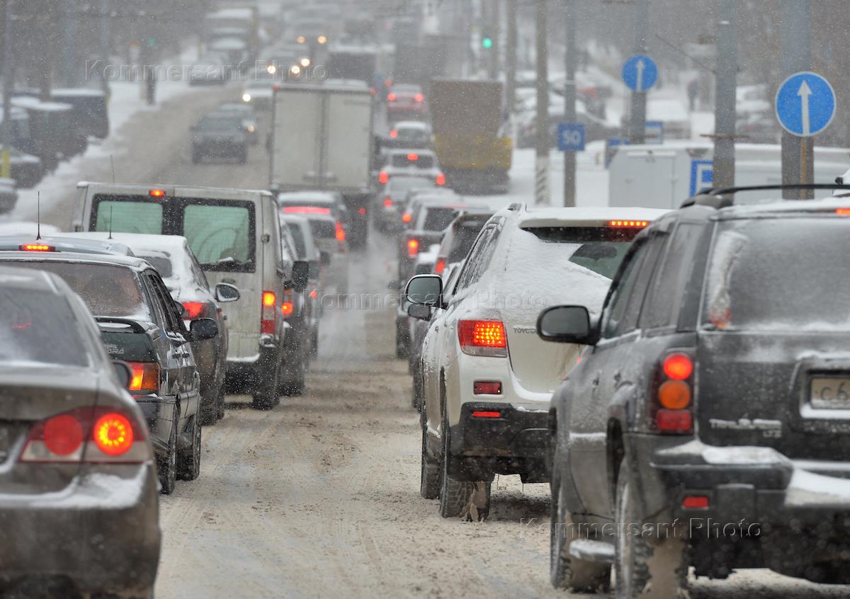 Метель в Москве. Автомобильные пробки на дорогах.