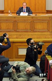 Политика П/к министра иностранных дел Российской Федерации Сергея Лаврова по итогам деятельности российской дипломатии в 2013 году в конференц-зале Корпуса № 1 МИД России.