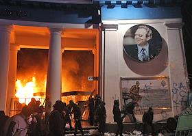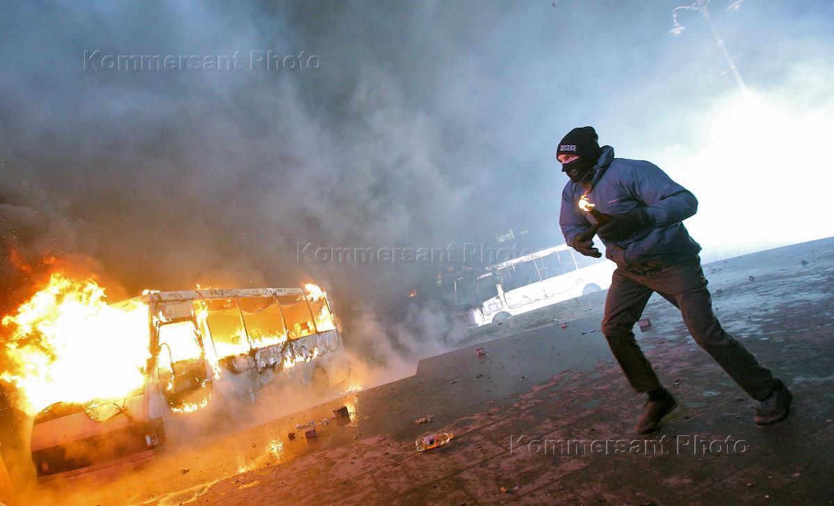 Горящие автобусы во время беспорядков возле стадиона "Динамо". Столкновения между сторонниками…