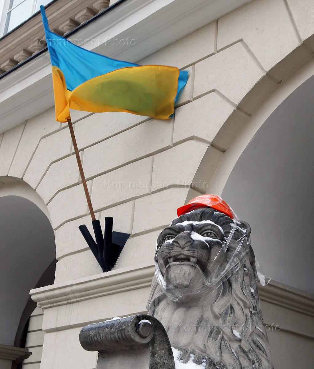 Евромайдан. Рабочая каска на скульптуре льва возле здания Львовского городского совета.