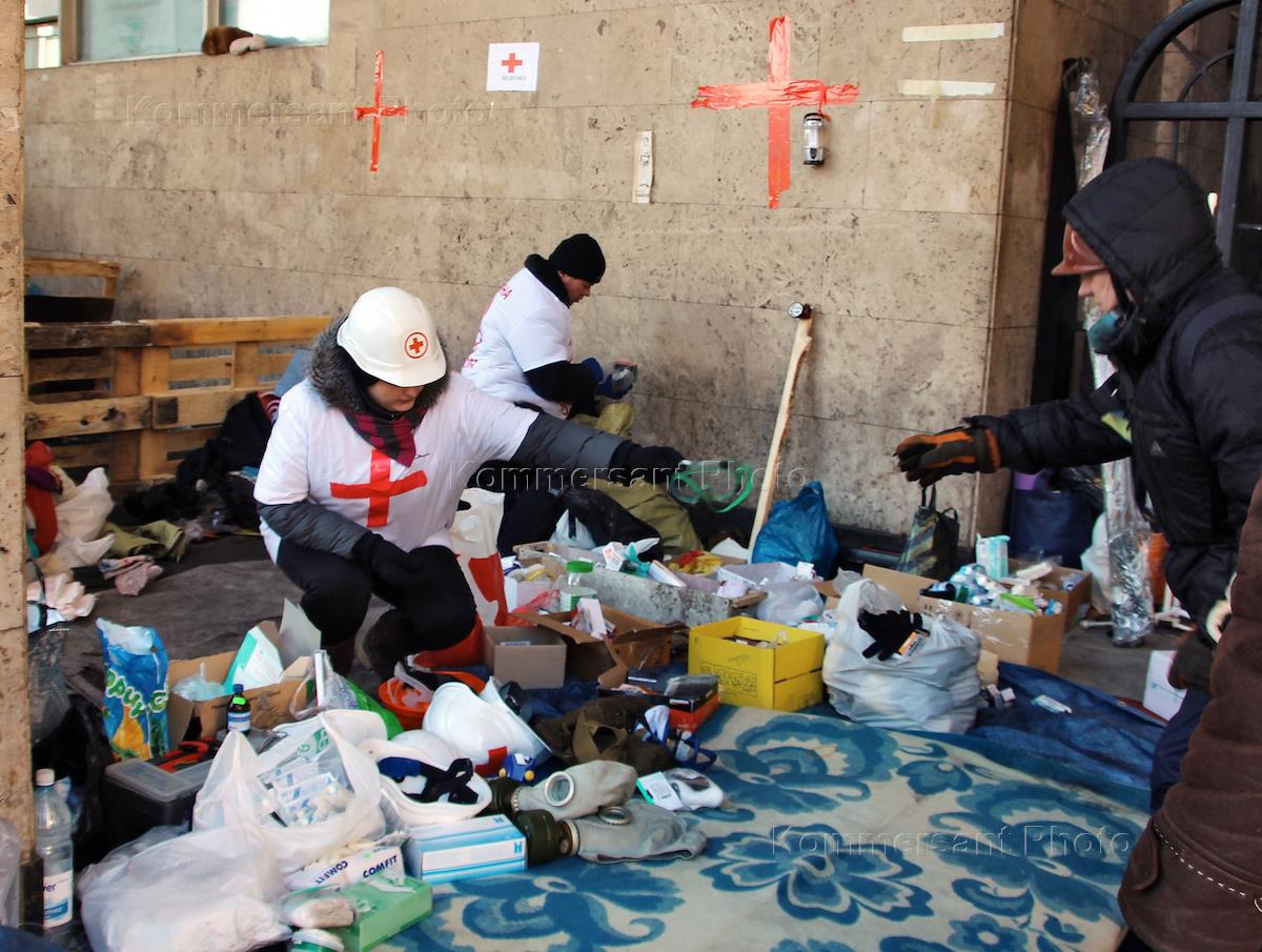 Евромайдан. Волонтеры на пункте медицинской помощи на Площади Независимости (Майдан Незалежности).