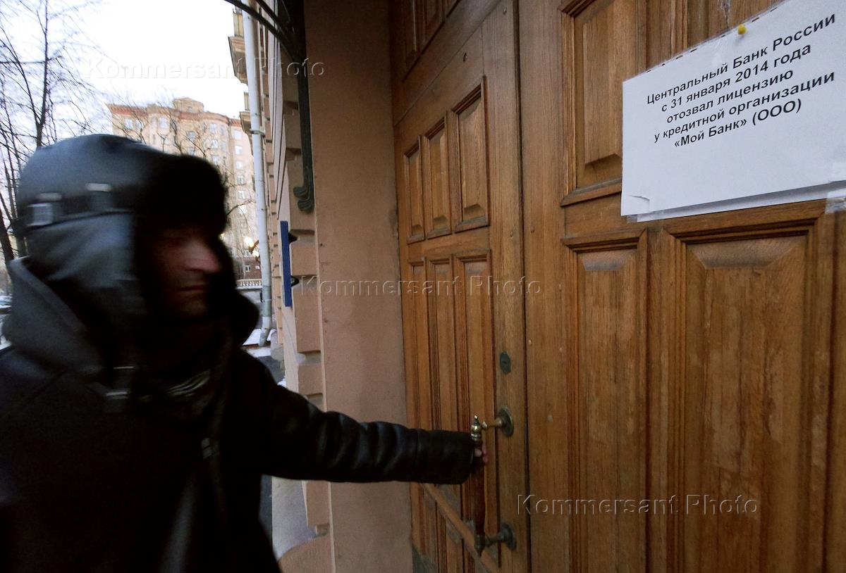 Посетитель у входа в офис банка "Мой банк" на Комсомольском проспекте. На двери объявление…