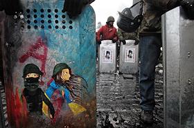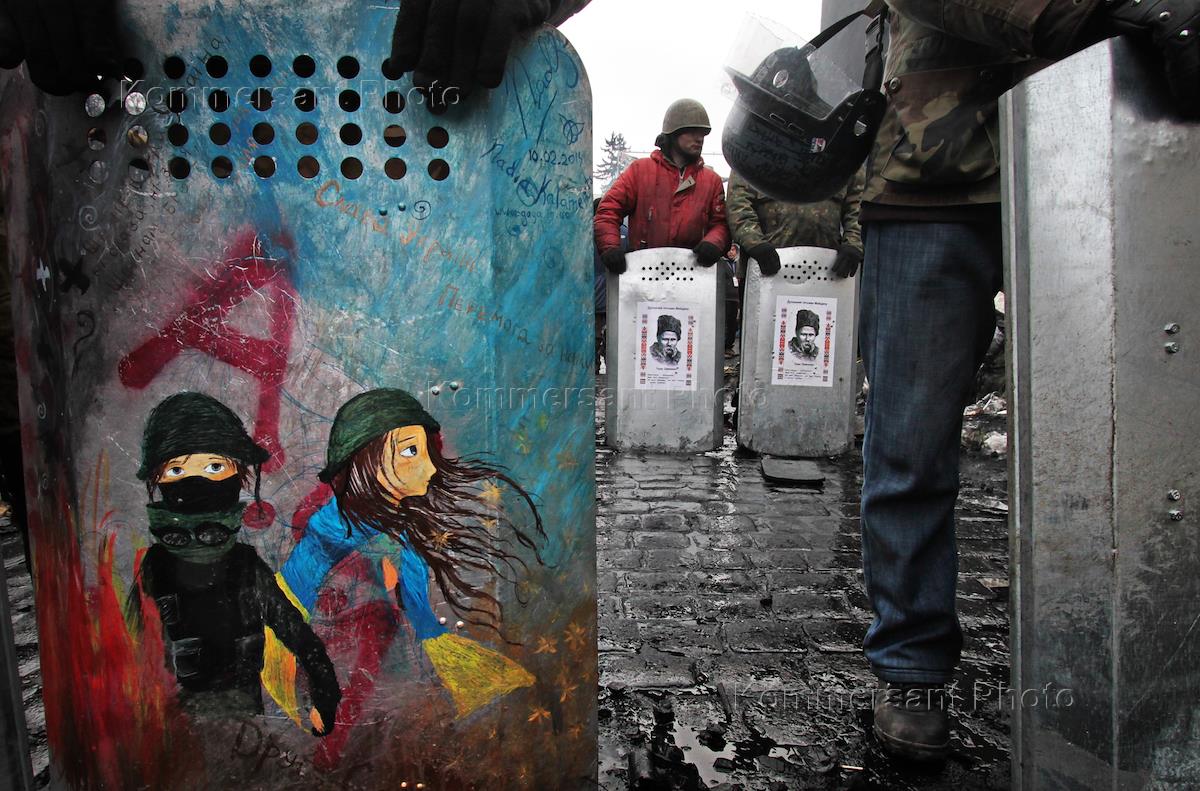 Евромайдан. Разборка баррикад на улице Грушевского. Сотрудники Беркута снимают свои флаги и…