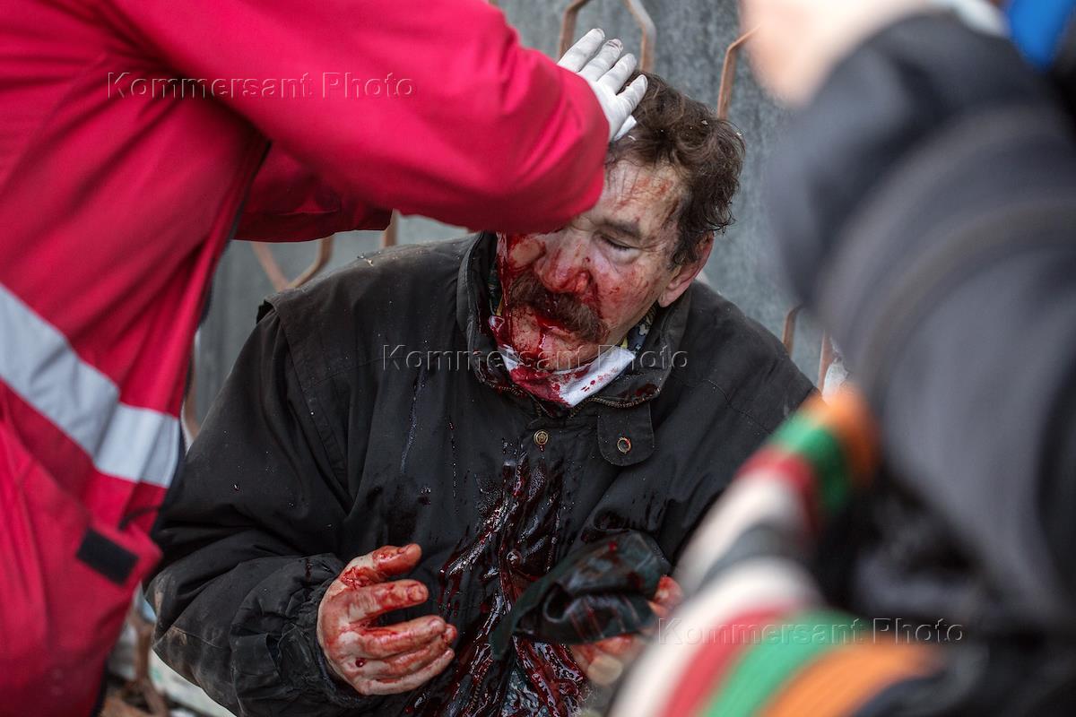 Евромайдан. Оказание медицинской помощи пострадавшему стороннику оппозиции на площади Независимости,…