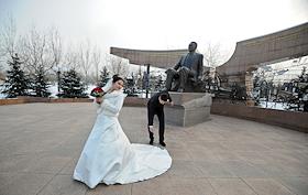 Виды Алма-Аты. Свадьба на площади перед монументально-скульптурной композицией "Казахстан",…