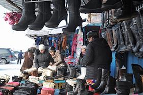 Виды Алма-Аты. Вещевой рынок. Уличная палатка по продаже обуви.