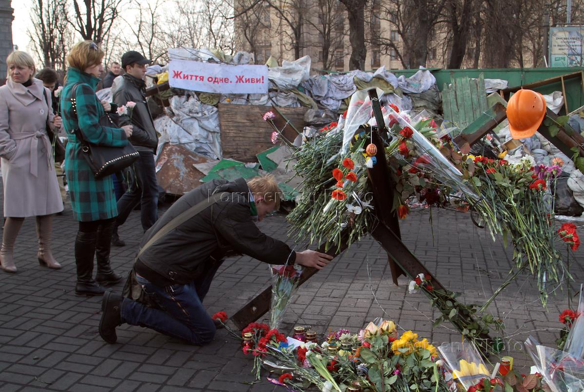 Евромайдан. Возложение цветов по погибшим возле баррикады на улице Грушевского.