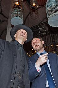 Художник Олег Кулик (в центре) и галерист, директор галереи "Риджина" Дмитрий Овчаренко (справа) на…