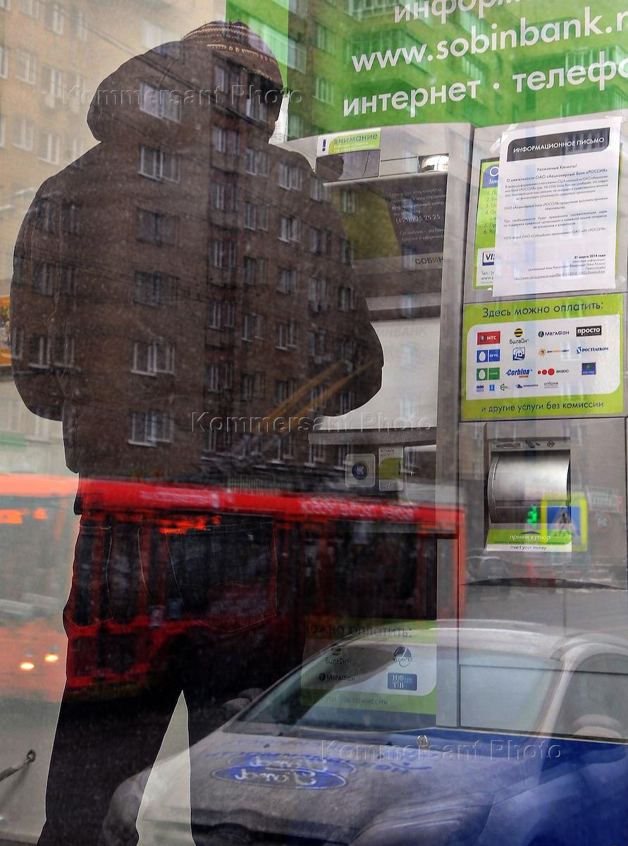 Мужчина снимает деньги в банкомате в отделении Собинбанка на улице Таганская, дом 29.