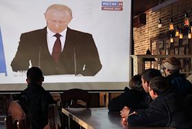 Молодые люди в кафе во время просмотра выступления президента России Владимира Путина.
