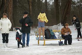 Праздник Крещение Господне в Серебряном бору. Участник крещенских купаний одевается, гуляющие люди.