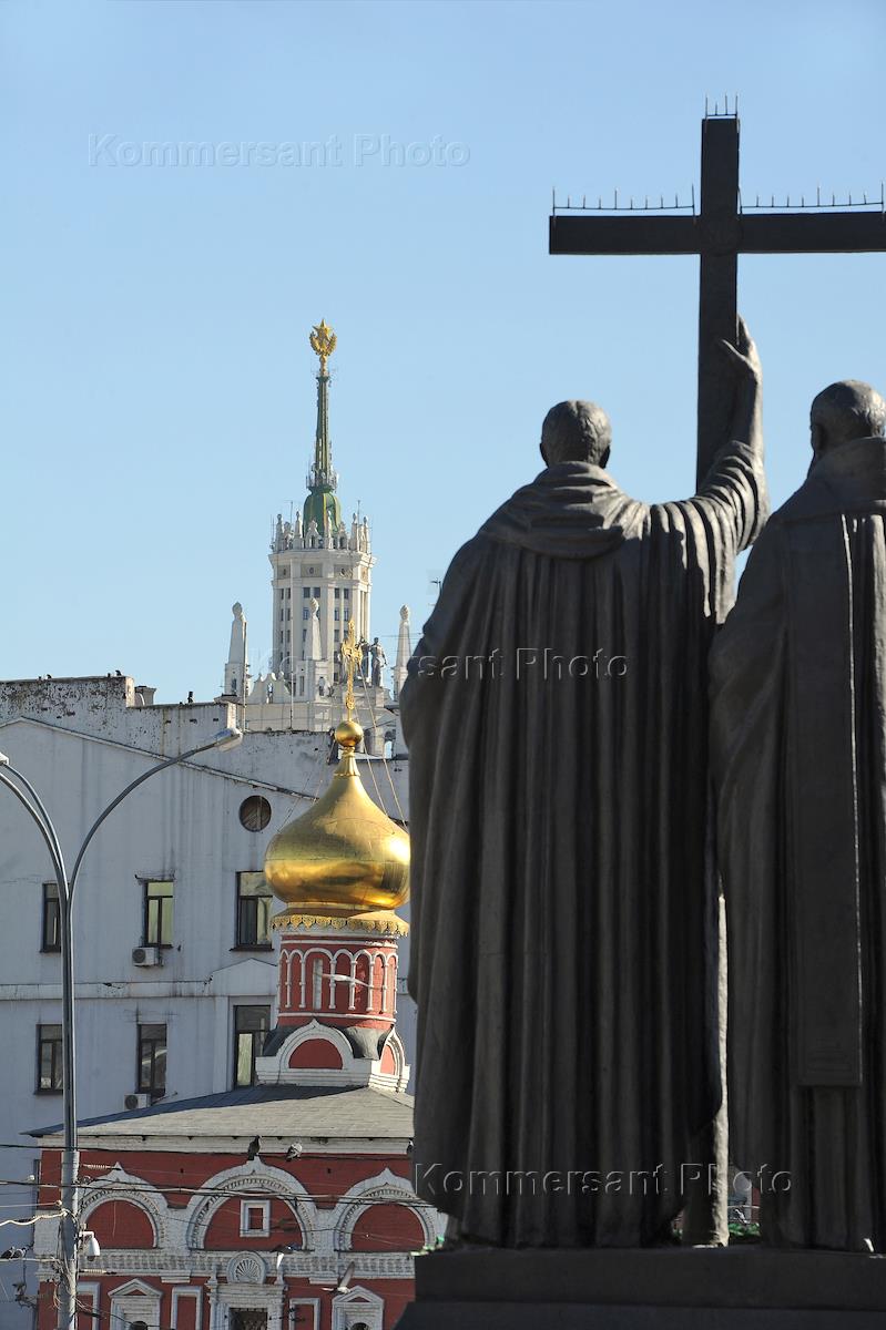 Виды Москвы. Памятник Кириллу и Мефодию на Славянской площади. Храм Всех Святых на Кулишках и шпиль…