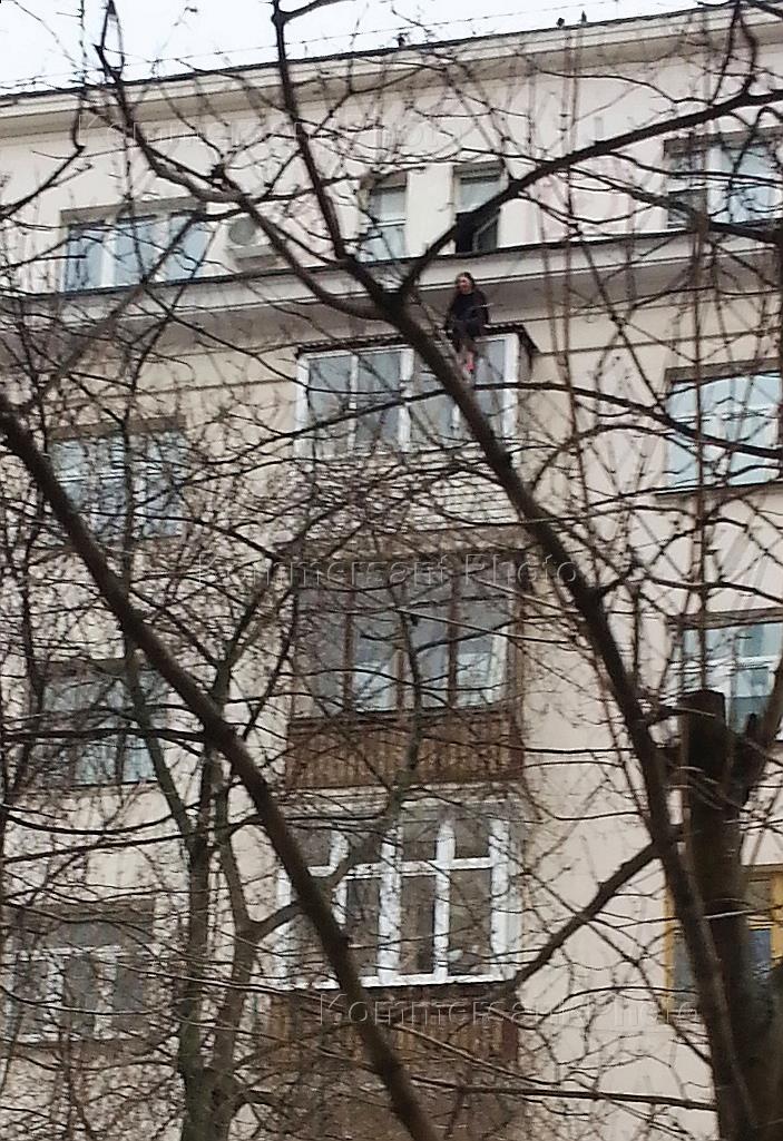 Женщина, сидит на крыше балкона, в попытке покончить жизнь самоубийством.
