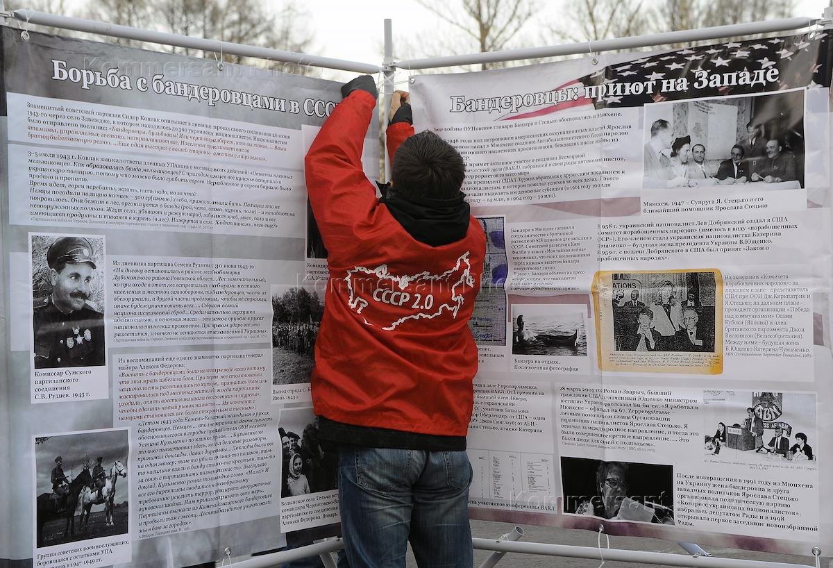 Политика Пикеты-выставки, посвященные преступлениям бандеровцев и их последователей, организованные членами движения "Суть времени", у метро "Университет".