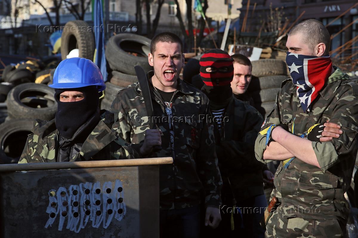 Политика Члены отряда самообороны Майдана на ул. Крещатик, недалеко от Печерского райсуда, где проходило слушание по делу бойцов "Беркута", в Киеве, в пятницу, 4 апреля 2014 г