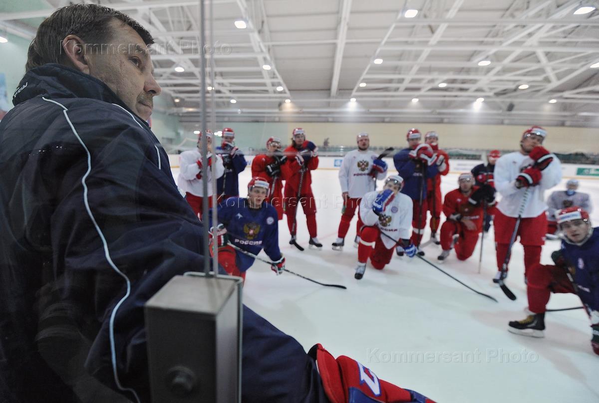 Главный тренер мужской сборной России по хоккею Олег Знарок (cлева) во время открытой тренировки…