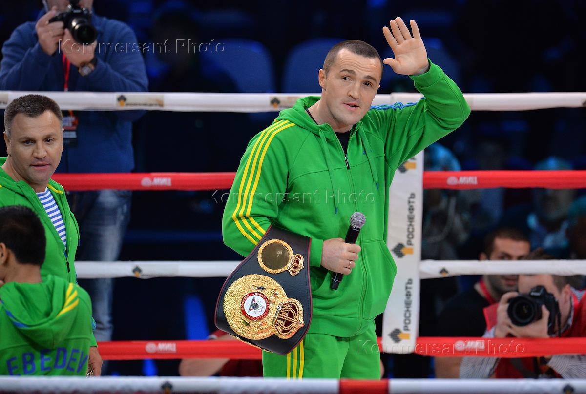 Чемпион мира в первом тяжелом весе по версии WBA Денис Лебедев (в центре) на стадионе "Динамо в…
