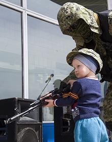 Политическая ситуация в Славянске. Жанровая фотография. Отражение мужчины в камуфляжном костюме в…