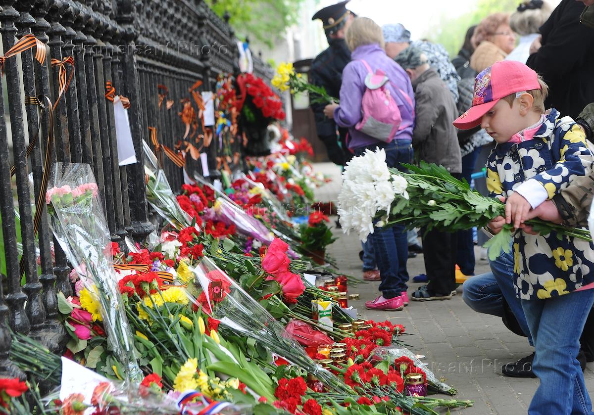 Возложение цветов к посольству Украины в память о погибших в Краматорске, Одессе и Славянске.