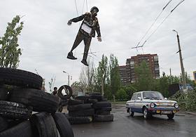Политическая ситуация на Украине. Баррикада на одной из улиц Славянска.