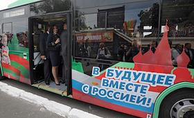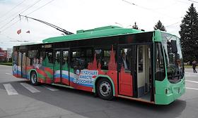 Виды Тирасполя. Троллейбус, подаренный Россией. Надпись на троллейбусе "В будущее вместе с Россией".