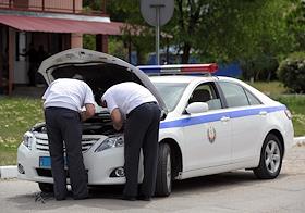 Жанровая фотография. Водитель автомобиля помогает сотруднику полиции зарядить аккумулятор служебного…