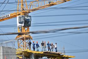 День международной солидарности трудящихся. Строители с высоты башенного крана наблюдают за…