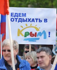 День международной солидарности трудящихся. Участник первомайской демонстрации с плакатом "Ура! Крым…