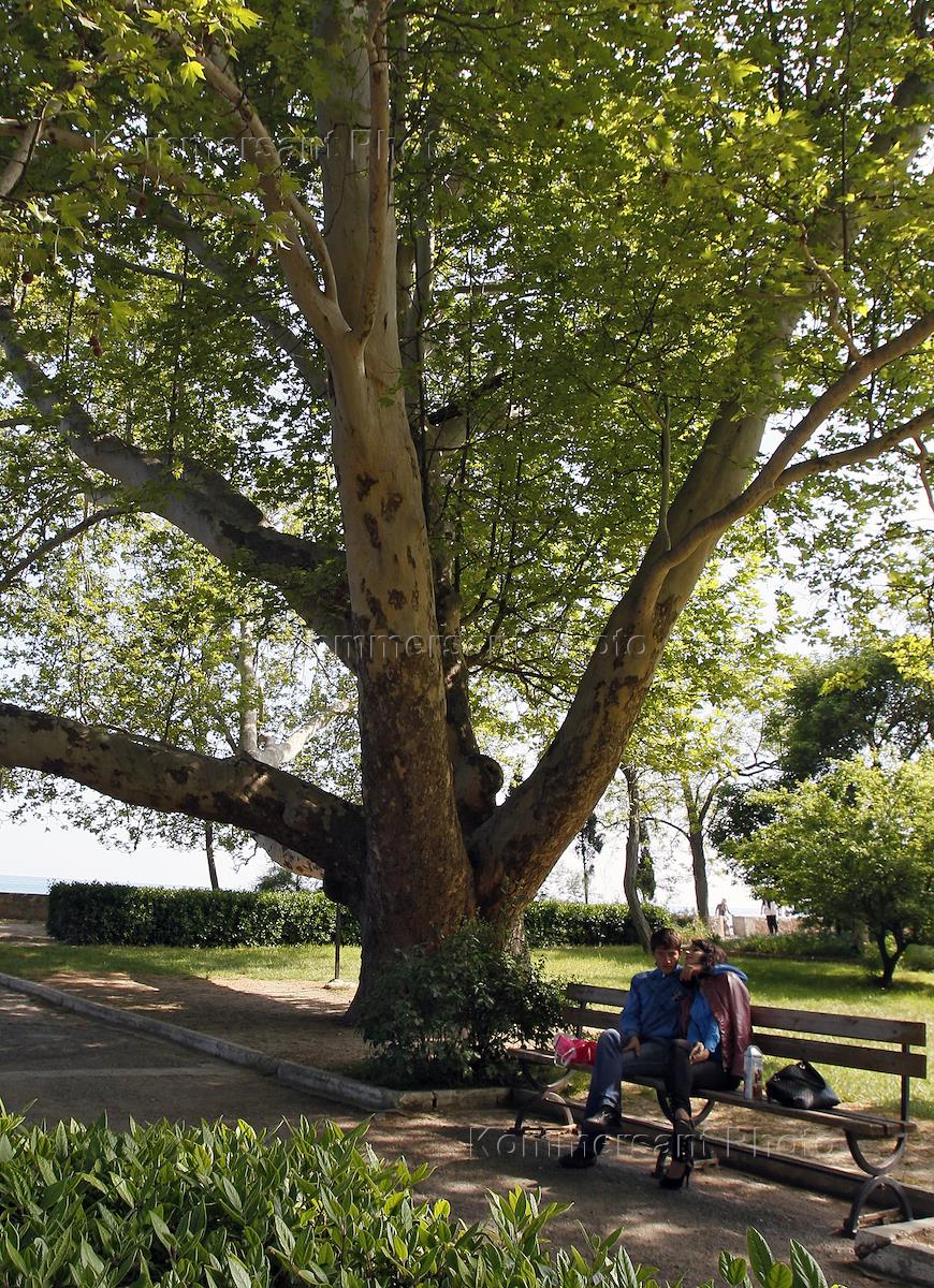 Крым готовится к курортному сезону. Молодая пара отдыхает на аллее в Алуште.