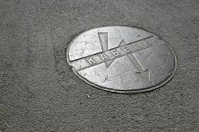 Жанровая фотография. Железный люк с надписью "Кабели".