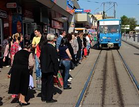 Люди на трамвайной остановке.