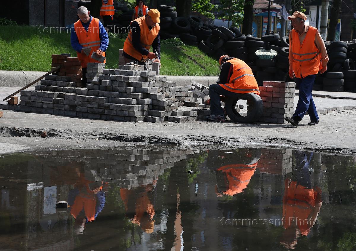 Виды Киева. Рабочие коммунальных служб города во время ремонта и укладки новой тротуарной плитке на …