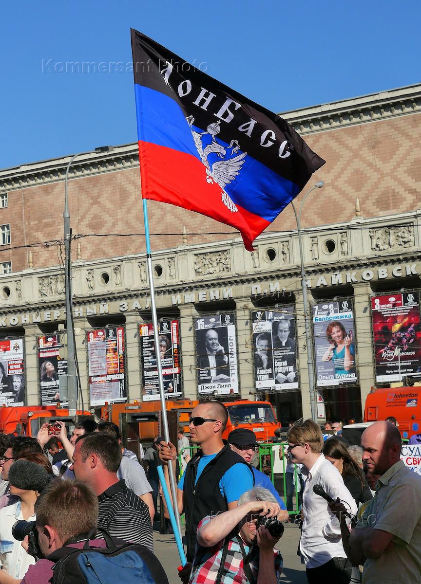 Участники акции с плакатом "Донбасс мы с тобой" на впервые согласованном с московскими властями …