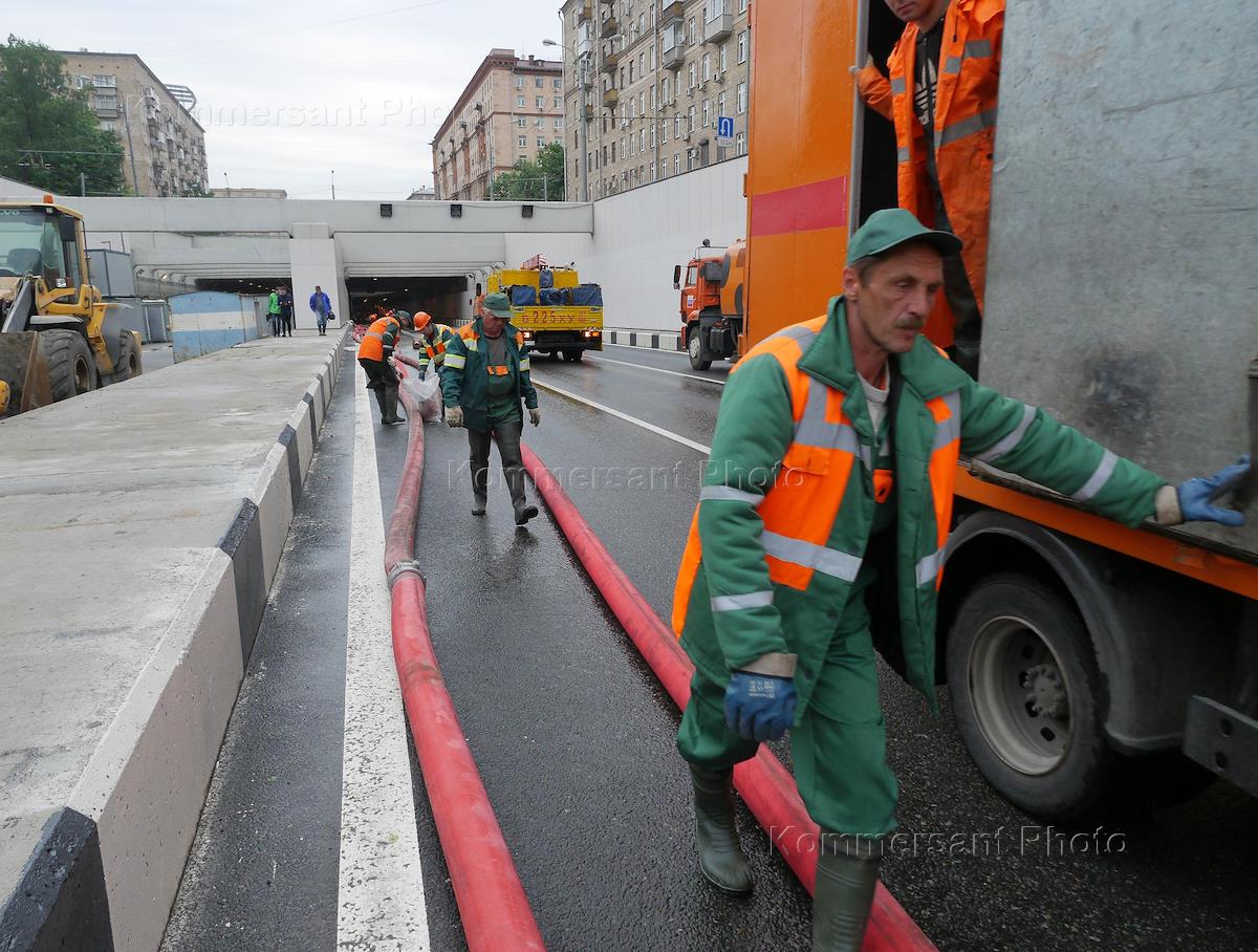 Работники коммунальных служб города во время устранения последствий затопления Алабяно-Балтийский…