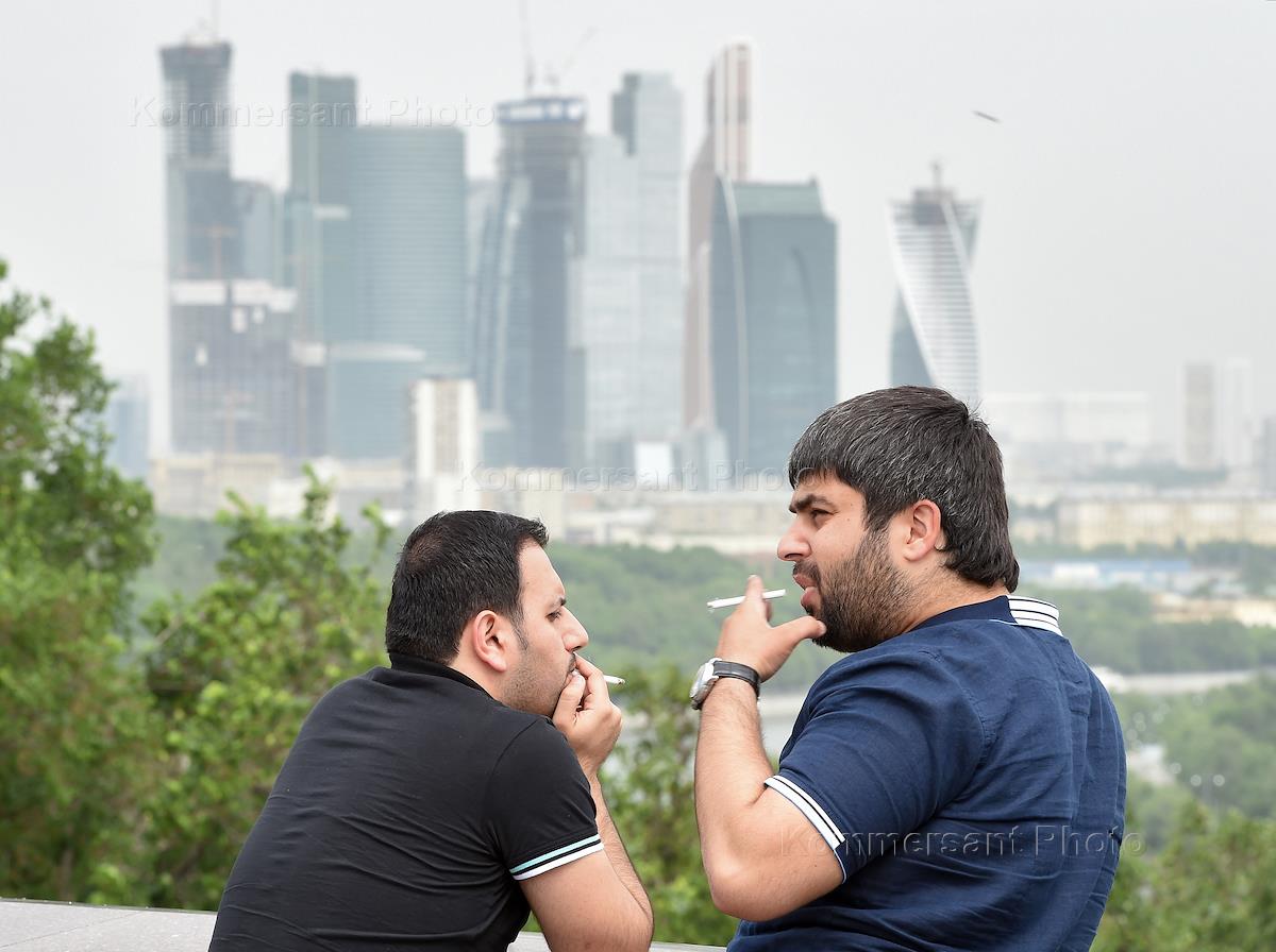 Жанровая фотография. Мужчины курят на улице после принятия Федерального закона России "Об охране…