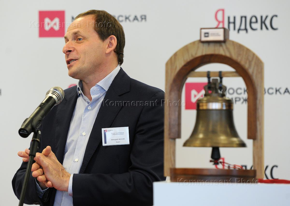 Экономика и бизнес Торжественное мероприятие на Московской бирже с участием Аркадия Воложа, генерального директора "Яндекса", и Александра Афанасьева, председателя правления Московской биржи