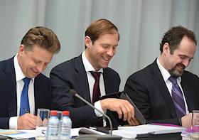 Слева направо: помощник президента России Андрей Белоусов, президент, председатель правления,…