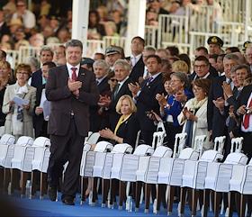 Избранный президент Украины Петр Порошенко (слева) во время церемонии празднования 70-й годовщины…