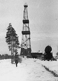 Нефтяное месторождение Пашня в поселке Нефтепечорск Сосногорского районаКоми АССР. Буровая вышка.