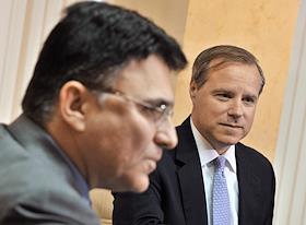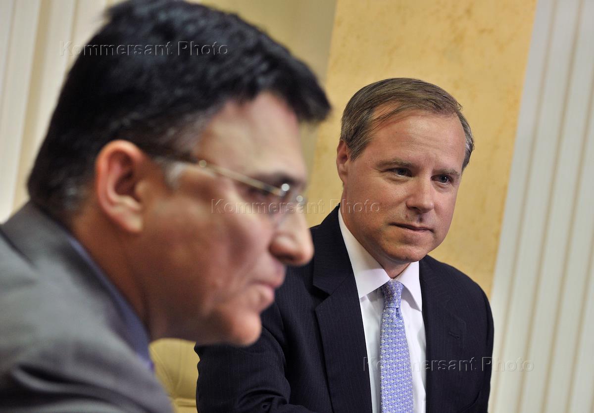 Руководитель Роскомнадзора Александр Жаров (слева) и вице-президент Twitter Колин Кроуэлл (справа)…