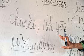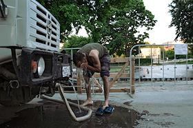 Жанровая фотография. Сотрудник коммунальной службы города на поливальной машине во время остановки…