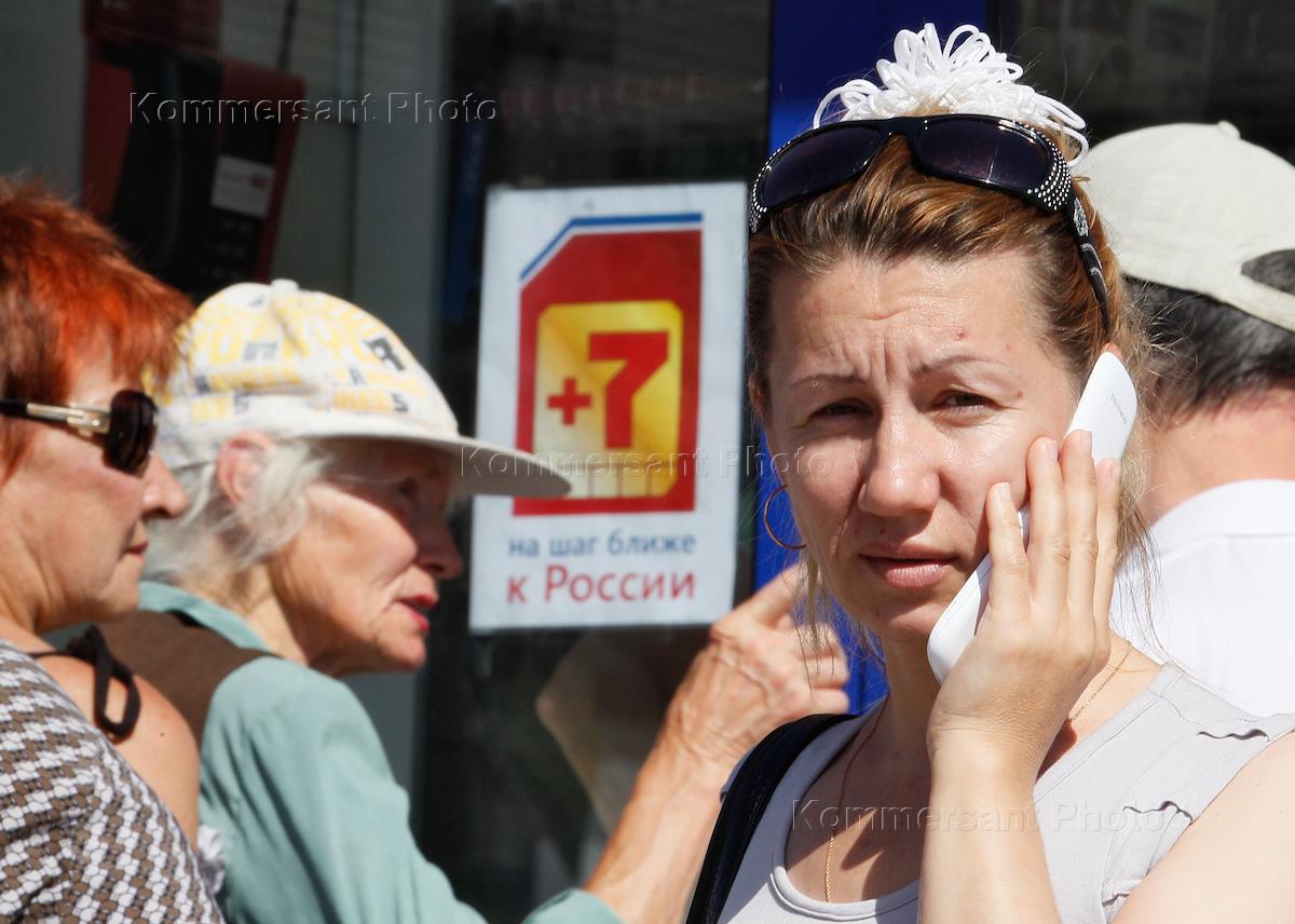 Люди у офиса оператора мобильной связи "МТС-Украина", который сообщил об ухудшениях связи и…