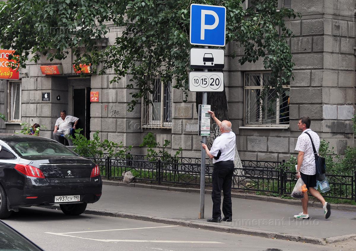Жанровая фотография. Дорожный знак "Платная парковка" на улице города.