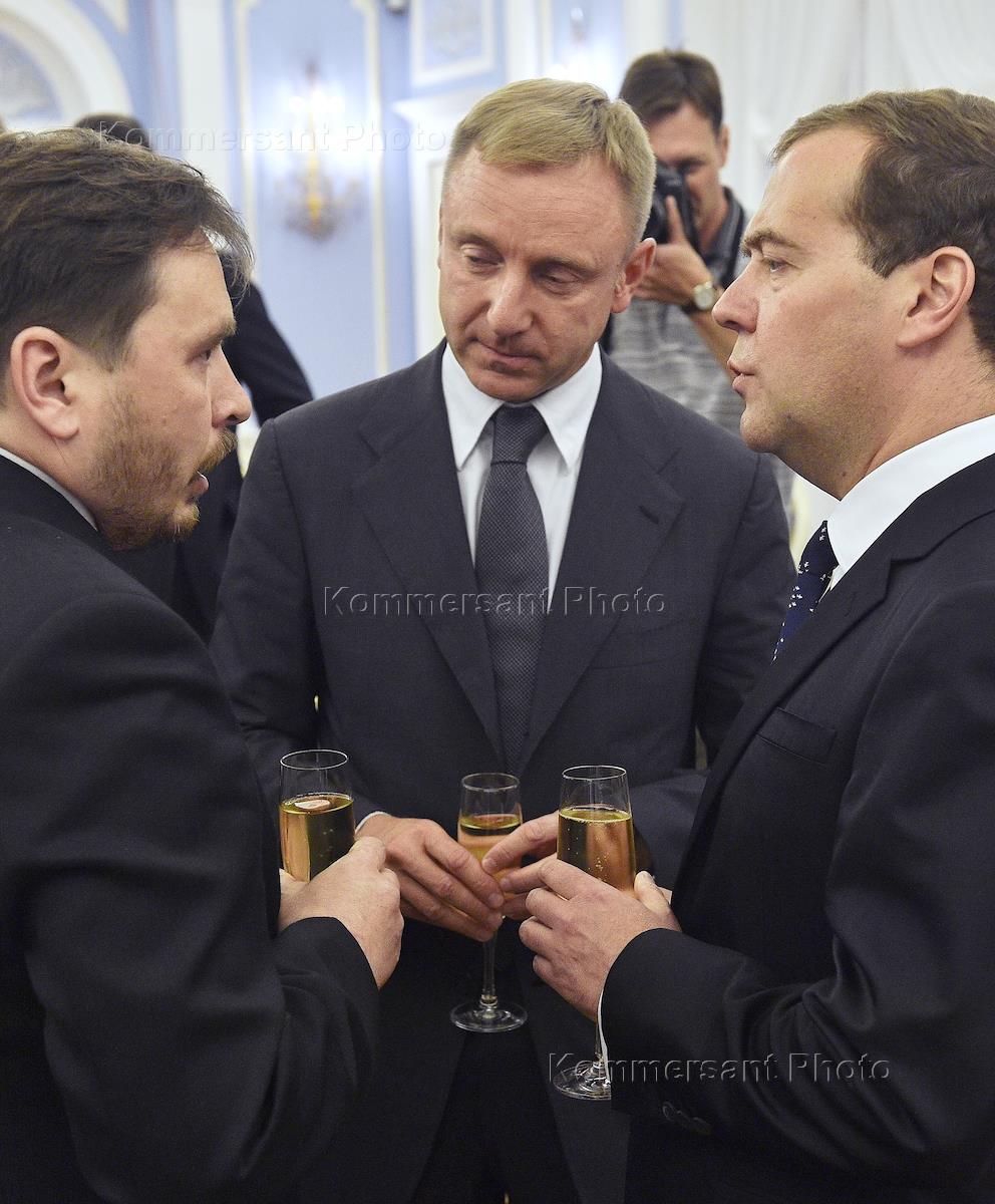Председатель правительства России Дмитрий Медведев (слева) на церемонии вручения премий…