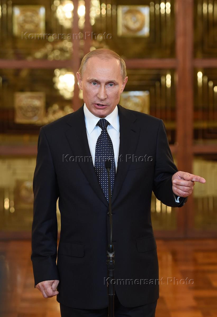Президент России Владимир Путин во время встречи с журналистами в здании министерства иностранных…