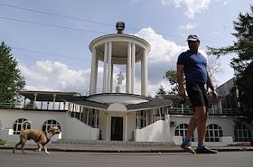 Мужчина с собакой на прогулке по территории Всероссийского выставочного центра (ВВЦ).