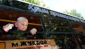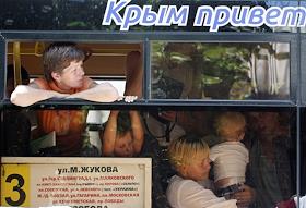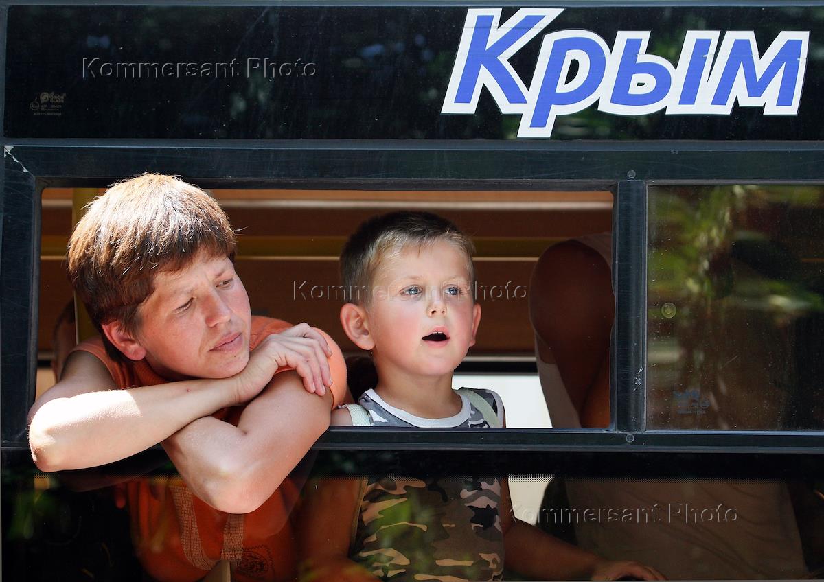Беженцы в автобусе, прибывшие из Луганска и Донецка в Крым.