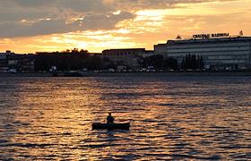 Закат на Неве. Лодка рыбака на фоне здания ОАО "Силовые машины".