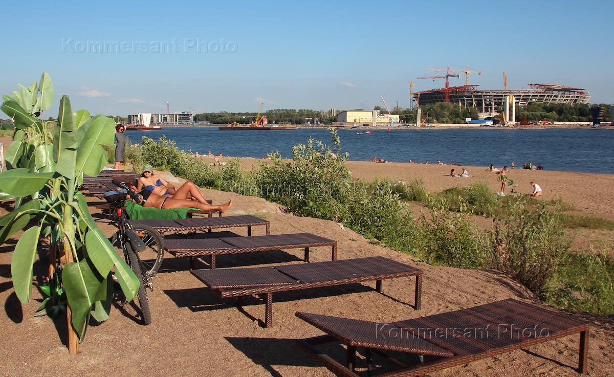 Лето в городе. Пляж в парке 300-летия Санкт-Петербурга. На заднем плане - строительство стадиона…