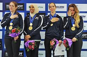 Чемпионат мира по фехтованию -2014. Спортсменки США слева направо: Энн-Элизабет Стоун, Ибтихадж…